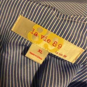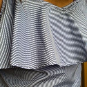 Spaghetti strap tank top with blue and white stripes. Ruffle detailing at the top.