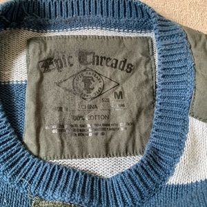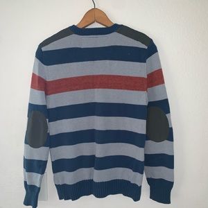 Epic Fabrics grey stripped sweater. Blue and red stripes with green patches. Size Medium 100% Cotton - New Condition