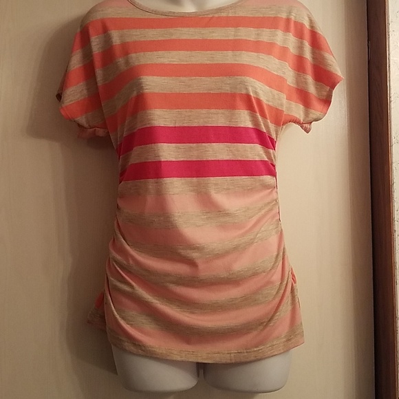 Medium Pink Stripped Top with Lace on the Back and singed hem on sides. Great condition. No stains or holes.