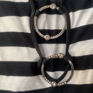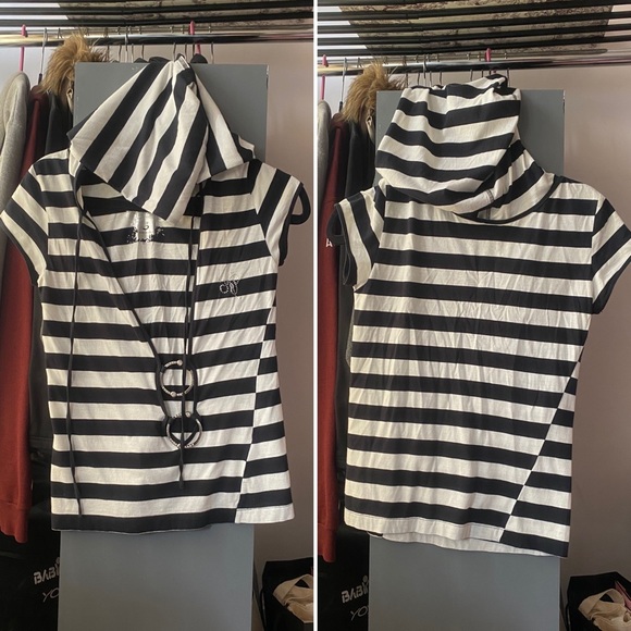 Why wear a simple t-shirt when you can wear one with a unique design? Beautiful hooded stripped top made with two circular hardware made with rhinestones. This is perfect to pair over black tank top or bandeau for a cute summer look.