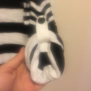 Stripped partly sheer 3/4 sleeve Express sweater . Button up roll sleeves . Some Light pilling on sides of thin stripes on front ( shown) and inside arms and light piling on back of larger stripes . Longer in the back . 66% cotton 34% rayon