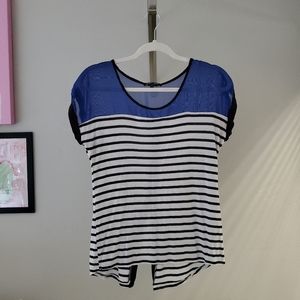Stripped whit and black T, with a sheer cobalt bue top. Lose fitting, super soft. Favorite part is the back! With real buttons, such a fun top to dress up or dress down. Size small to med