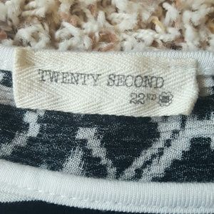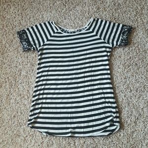 Black and white Stripped Tee. Aztec detailing on upper back and sleeve. Does have small stain on front, which I'm guessing is hair color (I'm beautician) good chance tide to go will take that out. Size large. Very stretchy. Depending on the fit you desire, I've seen size medium people wear the large for a looser fit and to wear as Tunic. As you can see in picture, I'm normally a large and am very tall so on me it is fitted and t-shirt legth