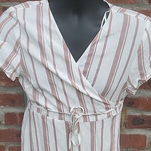 mauve and white stripped wrap dress. short sleeve. ruffled bottom. side tie wrap
