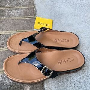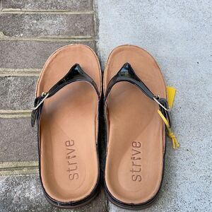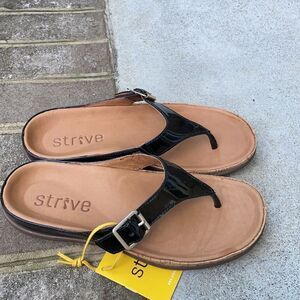 Strive Black Alba Buckle Sandals. Size Large ( 7.5-8 ). In like new condition. There is a tag still attached. The bottoms look like they have been walked on. Color is black. Comes from a smoke free home.