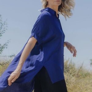 Take a stroll in the Stroll Top. Button up collar top with side slits, back pleat and high low hem.