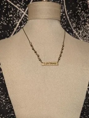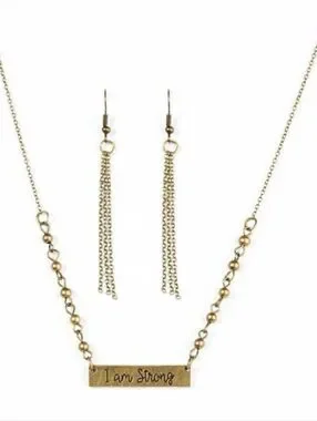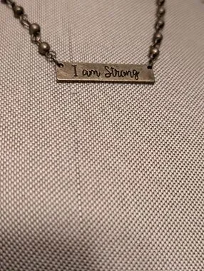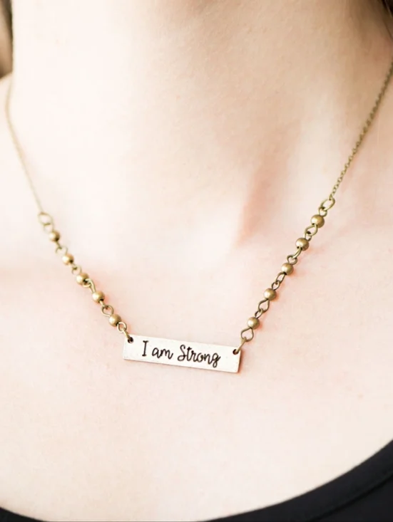 A glistening brass plate is engraved in the motivational phrase I Am Strong, creating an inspiring pendant below the collar. Features an adjustable clasp closure.