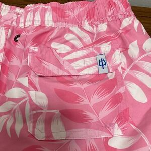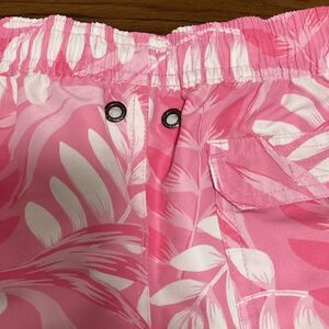 Strong Boat signature boys swim trunks in white & pink palm frond print. Inside Brand label serves as hook for hanging. 100 % quick drying polyester with peach finish. Features elastic waistband with cotton drawcord, boat metal grommets at waistband and backside. Logo label on back pocket, self draining side pockets, back pocket with Velcro flap & drainage buttonhole, mesh liner.