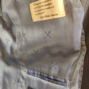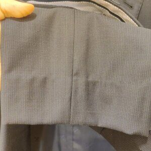 Navy microcheck suit. Soft tailoring, with minimal if any shoulder padding. See pic pressing the shoulders