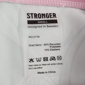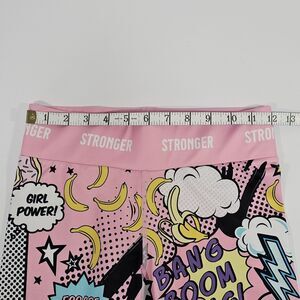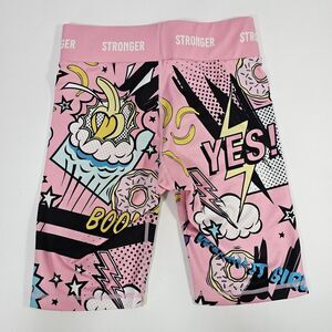 Bright, playful biker shorts featuring a pop art comic-inspired design in pink with bold graphics, including bananas, clouds, lightning bolts, stars, and empowering words like "Girl Power!" and "Bang Boom Bang!" Made from 85% recycled polyester and 15% elastane for flexibility, comfort, and durability. The shorts have a supportive high-waist fit and flat elastic waistband with the "STRONGER" logo. Condition is excellent with no flaws, gently pre-owned. Designed in Sweden and made in China, these shorts are perfect for gym workouts, dance, yoga, or casual street style. Fit: womens small. Recommended to wash inside out, do not use softener. Modern, unique activewear for anyone who loves standout, expressive fashion.