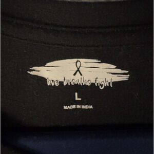 Black long-sleeve women’s T-shirt featuring a blue and pink ribbon design for breast cancer awareness. The front graphic reads “Stronger Together,” with the “O” in Together represented by a pink ribbon. The inside label reads “Live, Breathe, Fight” with a ribbon graphic, reinforcing the breast cancer awareness theme. Made in India and suitable for casual everyday wear or awareness events.