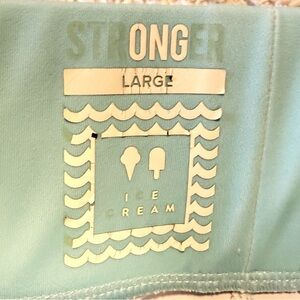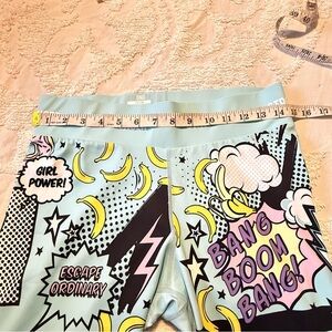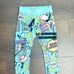 Elevate your style with these playful comic print leggings by Stronger. The vibrant turquoise design adds a fun twist to your casual look.