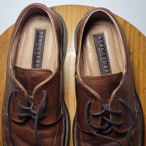 Step into comfort and style with these Structure Men's Brown Oxford dress shoes. The classic lace-up design, combined with a sleek brown leather upper, makes these shoes a versatile choice for any wardrobe. The durable leather outsole and insole promise longevity and support, while the cushioned feature ensures your feet stay comfortable throughout the day. Crafted with meticulous attention to detail, these shoes boast a solid pattern that complements a variety of outfits, from sharp business casual to polished formal wear. The shoes are a size 9.5 with a standard D width, ensuring a great fit for most feet. Whether you're heading to the office or celebrating a special occasion, these shoes are a timeless addition to your collection.