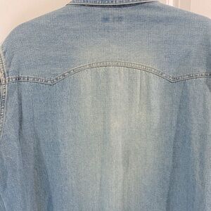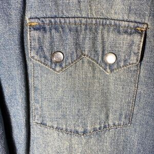 Western style Jean denim shirt with snap buttons and chest pockets. Distressed look in an excellent used condition. Men’s Size Medium 38-40.