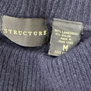 The Structure Women's Lambswool Crewneck Sweater in navy blue, size medium, is a classic and versatile piece perfect for casual occasions. Made with tight-knit lambswool material, this sweater features long sleeves and a crew neck neckline for added comfort and warmth. With its solid color and pullover style, this sweater is an essential addition to any woman's winter, fall, or spring wardrobe. It is recommended to dry clean only to maintain its quality and prevent shrinkage. Sweater is in good, pre-loved condition, with a small repair on the back of the left sleeve (see last pic).