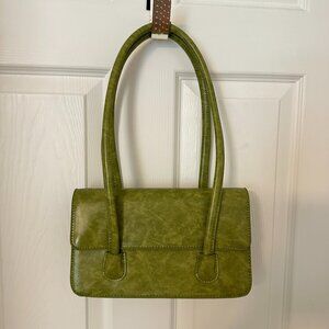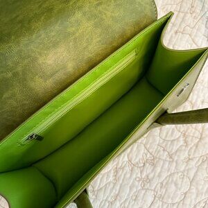 Chic & trendy structured handbag in a unique green faux leather. Features a flap magnetic closure, double top handles, spacious main compartment, and interior zip pocket for essentials. The structured silhouette gives it that elevated, minimalist vibe that's perfect for pairing with both casual and dressy looks. Statement color yet classic shape so it's a great bag with a pop of personality.