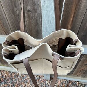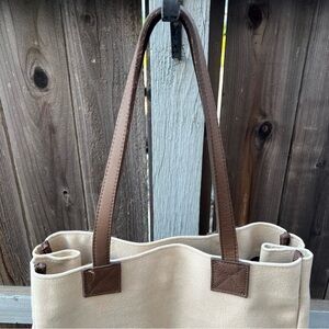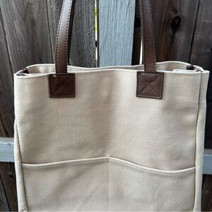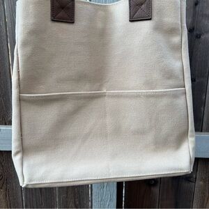 Structured Canvas Tote Bag Large Beige RH Brown Leather Straps Classic Shape
