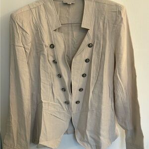 Lightweight cream blazer with a tailored, structured fit. Double-row button front and subtle seam detailing for a refined look. Neutral cream color pairs easily with dress or casual outfits.