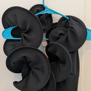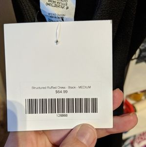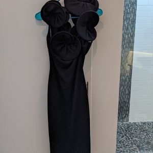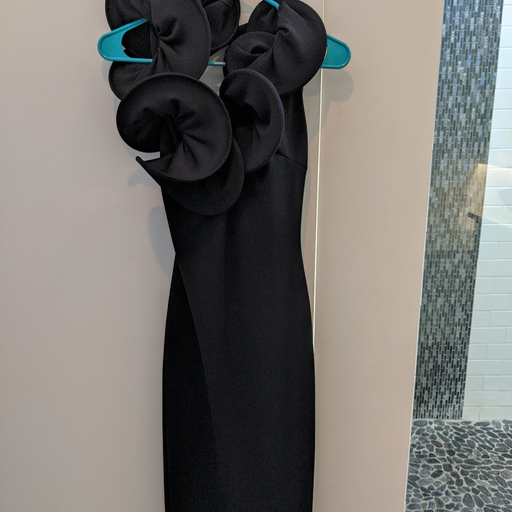 This dress makes a statement! It's NWT, never worn. Length is below the knee. It's a stretchy, soft fabric. The collar is structured and eye catching. No need for accessories, this dress will turn heads!