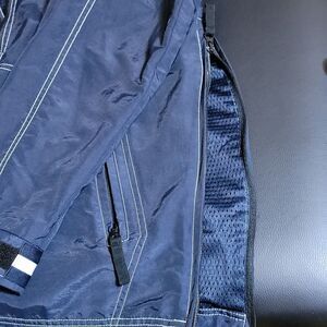 Navy blue unisex pullover rain jacket by structure. It has a side zipper relief for ease. Velcro adjustments on sleeves and collar with a drawstring at the waist. Size s
