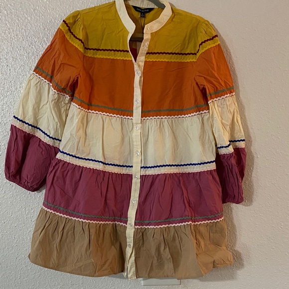 Tiered/flare dress with elastic wristband and has pockets! Ric-rac trim in multiple colors may each tier; buttons down front