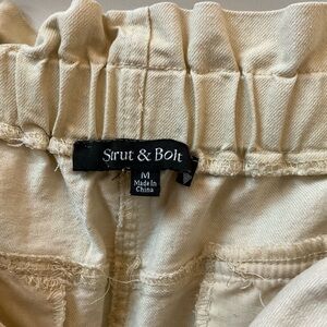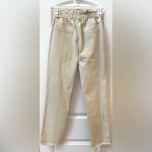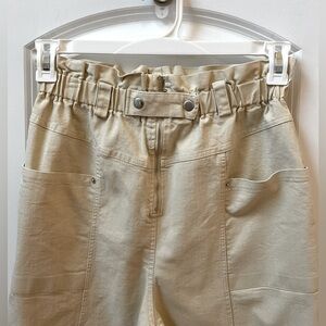 Strut & Bolt Paper Bag Waist Pants in Cream. Rayon/Nylon/Spandex. Size Medium measures a 27” Waist (before stretch) x 27” Inseam. Features High Waist with Fancy Snap Closure and Frayed Hem.