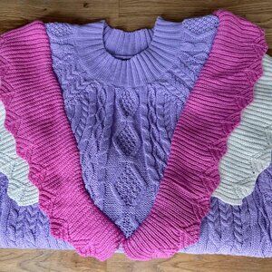 Style: Long- sleeve cable knit sweater, crew neck, ruffle detailing in contrasting colors with a V-front design