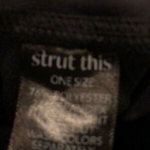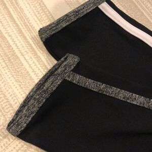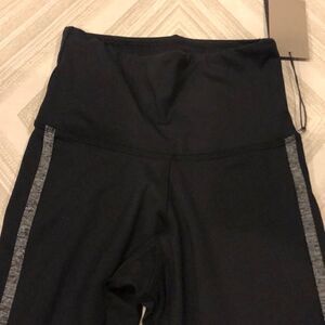 Strut This Black Leggings w. White & Grey Side Stripes. Grey ankle trim. High waist. One size. First 0-4. Made of polyester and spandex. Inseam approx 25”. NWT.
