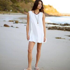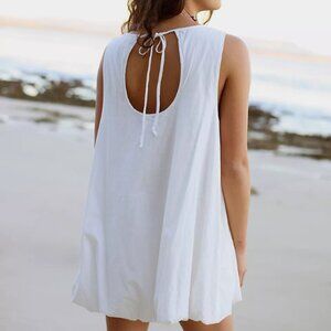 Features: Dropped armholes, high neckline, back keyhole closure, banded bubble hemline