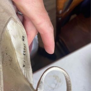 Beautiful cream/gold toned, close toe, sling back heels. Low heel, perfect for dancing and comfort. Rhinstone detailing on strap. In great shape!