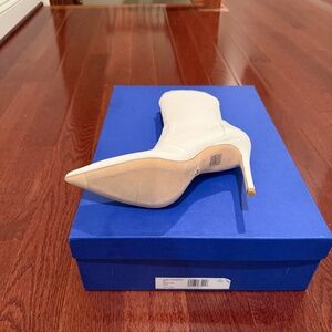 Stuart Weitzman Stretch Nappa Leather Pointed Toe Bootie. Stiletto Heels, 3.9 inch heel, Pull On, Leather insole and Leather outsole.