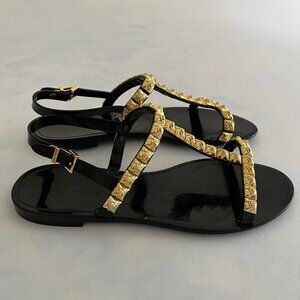 -Details: Jelly sandals detailed with golden metal rose-shaped studs and adjustable ankle strap, in excellent like-new condition (worn 1x), comfortable and easy to walk in