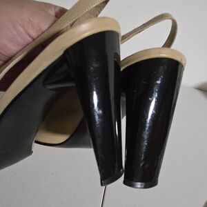 In pre-owned condition, wrinkles and scuffs, Cream Tan, Black heel, Slip on, Sling back, Square toe, Step out in style with these elegant black high heel sandals. Perfect for any occasion, these shoes offer formal and sophistication. Stuart Weitzman Vintage Sling Back Square Toe Office Career Leather Heel, Size 8.5.