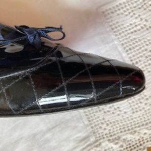 Stuart Weitzman Classic Kitten Heel 2 1/2" heel, pump, Black Patent Leather with chic blue stitching. Is labeled a Size 10N, but these run small and are really a size 9 1/2 N. I had a few friends try them on, we collectively decided they are 9 1/2 US. Will fit anyone size 9 1/2" but not if your foot is extra wide. Barely worn, the patent leather has no scuffs, the heel is not worn at all. However, please note that these shoes originally had dark blue grosgrain bows which are broken on one shoe. What I would do is cut the bow off the other shoe, and find a shoe clip, or make one out of an old pair of earrings. Please look carefully at the detailed photos I took. The last photo is an example of what these shoes would look like with a clip-on decoration.(the clip in the photo does NOT come w the shoes). You could also just glue on a bow, or use various clip ons to match the shoes to your outfit. Price reflects the lack of the bow. They are beautiful well made shoes.