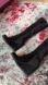 50/50 OTK Leather and stretch fabric upper, leather lining, rubber sole, hidden wedge heel 4.25” approximately. Some light marks at back of heels. Suede also has a naturally occurring variance of color and texture not to be considered flaws.