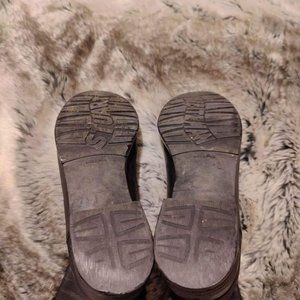 Stuart Weitzman 5050 boot. The leather is in great condition besides a small scuff on the toe of the right boot. The stretch back has been professionally repaired at the ankle after developing some small tears (shown in photos). There have not been any more issues after the repair. Tred is in good condition but these are lifetime boots and can be replace by any cobbler.