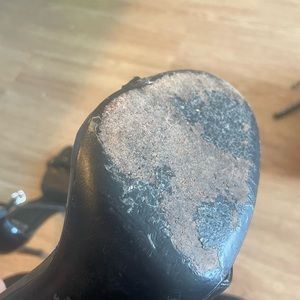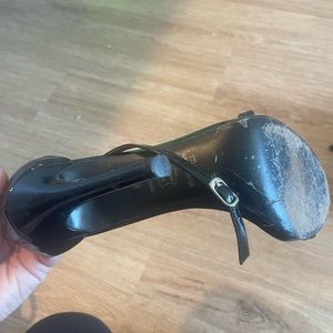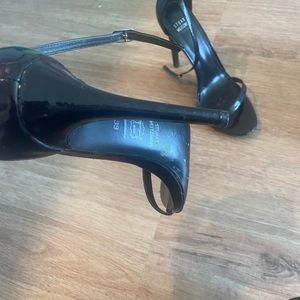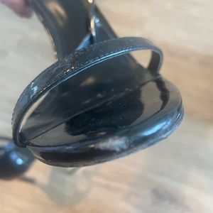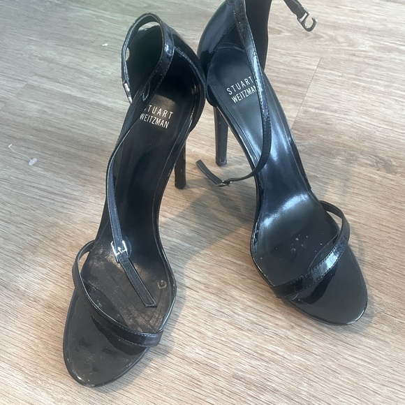 Stuart Weitzman Nudistrong Sandal in black patent leather. Both sandals have a small streaked on front on both shoes, please see the pictures. Size 39