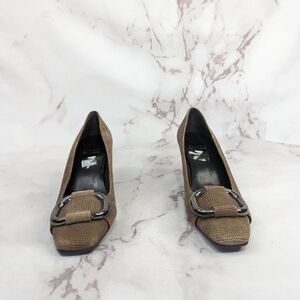 Stuart Weitzman 6.5 M Block Heel Pumps Women Tan Square Toe Buckle Snakeskin