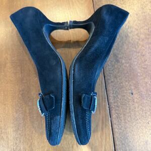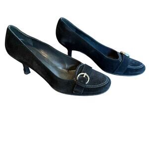 Design/ features: These stylish Stuart Weitzman Pumps are made out of a Suede material, and come in a Black color / Solid pattern. Styling includes a silver toned buckle detail over toe. Gray top-stitch detailing. 2 3/8" Heel height; Leather insoles