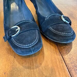 Stuart Weitzman 6.5M Black Suede Leather Madeline Loafer Pump Buckle Heel w/ Box