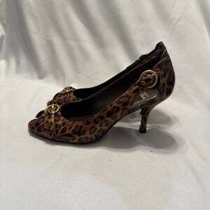 Elevate your ensemble with these Stuart Weitzman Leopard Print Peep-Toe Heels in Women's Size 9. These sophisticated pumps feature a striking animal print pattern with a polished patent finish and signature buckle detailing at the toe and ankle.