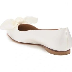 Step into elegance with Stuart Weitzman’s ANNY MESH white silk satin bow flats. Perfect for brides seeking comfort and style on their special day.