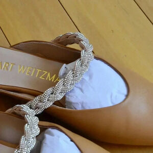Stuart Weitzman Addison flats in camel leather with gorgeous crystal embellished strap.