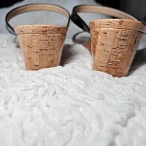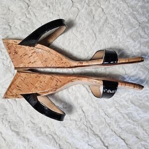 A graceful slide for day or night, this Italian sandal is styled with slender tapered straps on top of a glossy cork-wrapped wedge in a sturdy sculpted shape.