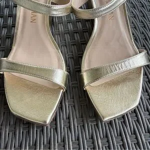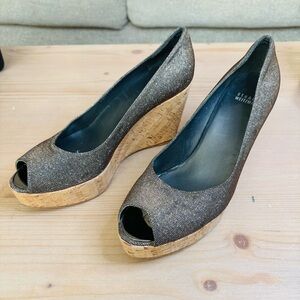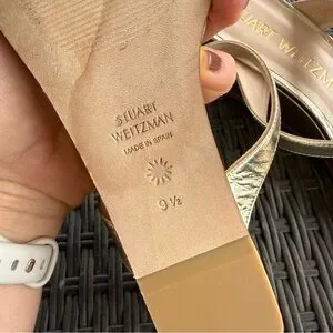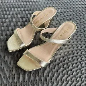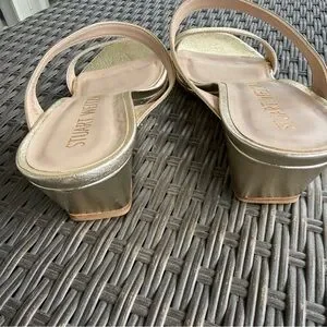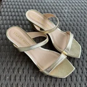 LIKE NEW Stuart Weitzman Aleena gold, square toe wedge sandals.