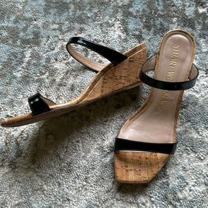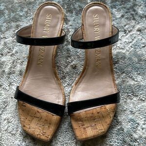 Stuart Weitzman Aleena Wedge Slide Sandal. Square toes. Black patent straps. Size 6. Excellent condition. Nonsmoking home.