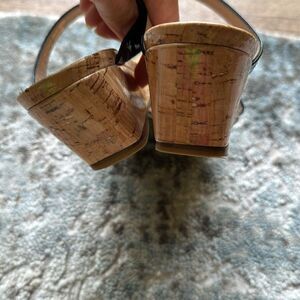 A graceful slide for day or night, this Italian sandal is styled with slender tapered straps on top of a glossy cork-wrapped wedge in a sturdy sculpted shape.