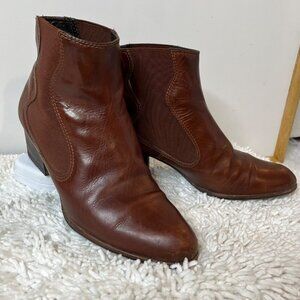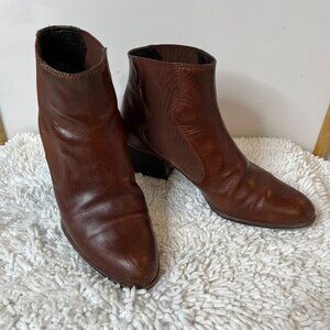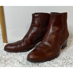 Stuart Weitzman Almond Toe Stacked Heel Leather Chelsea Ankle Bootie Brown 7