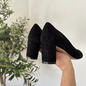 Details: Stuart Weitzman Amata 60 Leather Suede Round Toe Pumps - Size: 7- Color: Black- Material: Leather Suede - Features: Slip-on, almond toe, block heel, leather insole & outsole. With its precisely-shaped almond toe and rounded block heel, the AMATA pump slip-ons are masterfully minimalist, subtly nuanced and anything but average. Wear yours with a sleek, tailored blazer and split-front pants or an embellished top with a luxe leather skirt.