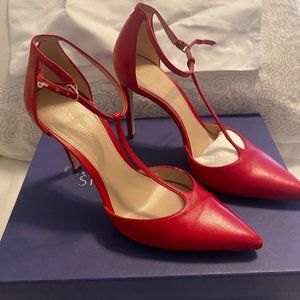 Stuart Weitzman Amity Lipstick Red Pointed Toe T Strap Heels 7M